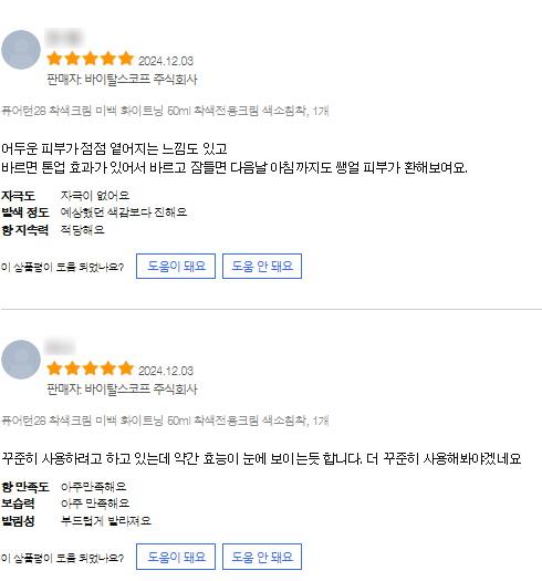 많은 사용자들이 꾸준히 사용 후 착색된 피부가 점차 밝아지는 변화를 느꼈다고 합니다.
